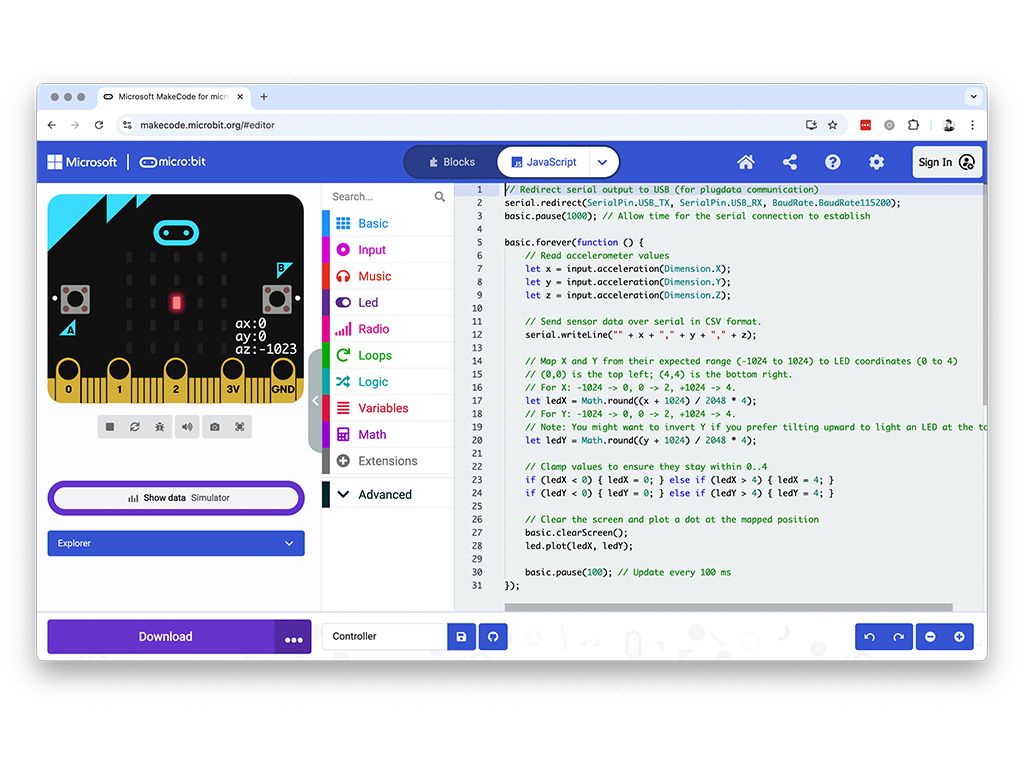 - flashed a custom JavaScript program onto the micro:bit to continuously send accelerometer data,