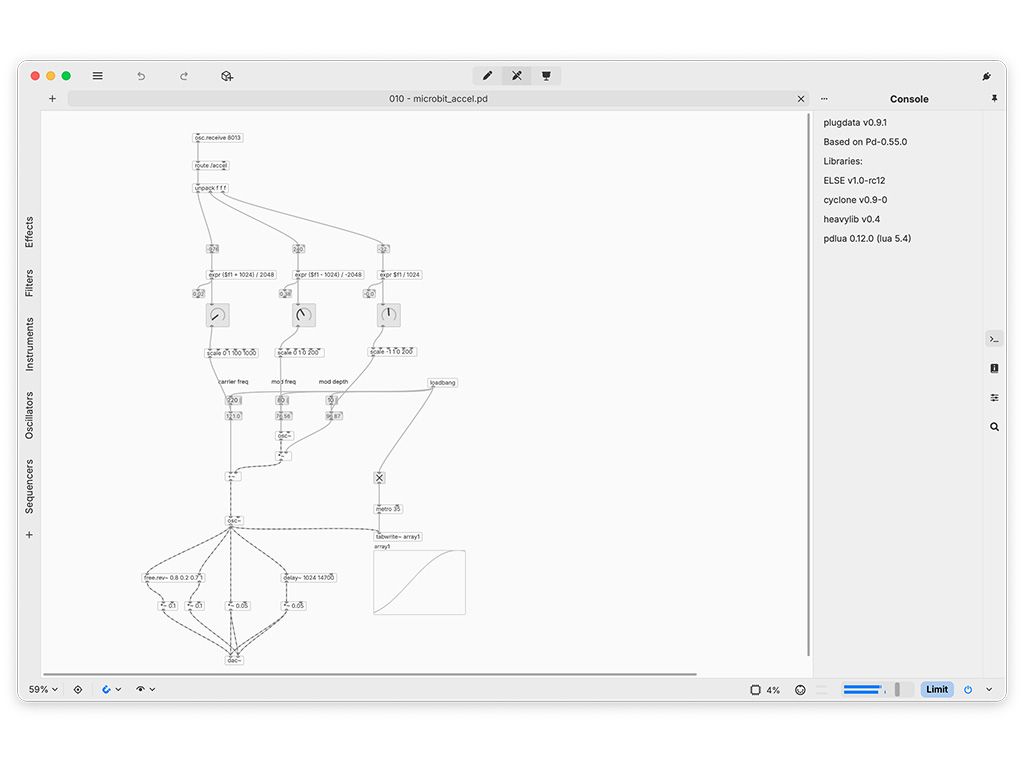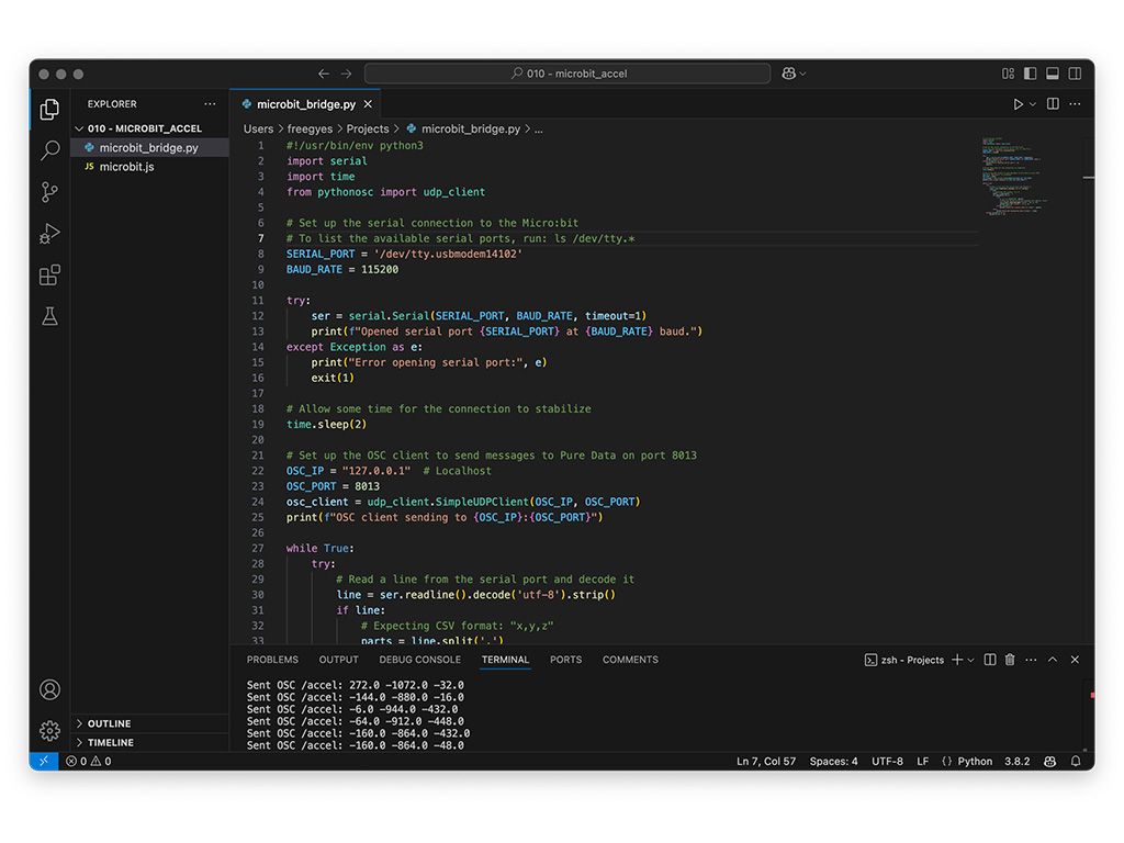 After spending hours patching in plugdata, I wondered—what if I could control sound with motion? I had an early version of a micro:bit lying around, which has a built-in accelerometer. The idea was simple: use the XYZ coordinates of the micro:bit's accelerometer to modify parameters in my patch.