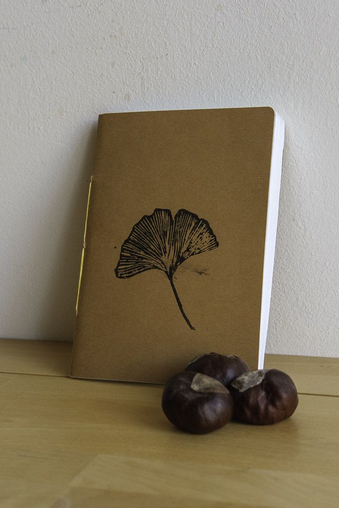 I carved a ginkgo leaf from lino—it turned out surprisingly decent for a first try. Then I bound a small A6 notebook: cardboard covers, Rives textured paper, simple pamphlet binding with waxed thread.